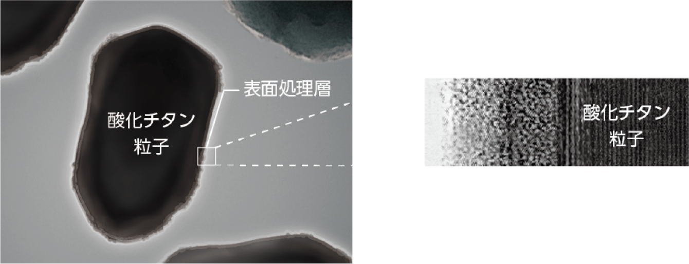厚い多重構造無機バリア層で酸化チタン(白顔料)の表面をコートして紫外線の侵入を防ぐ。
